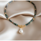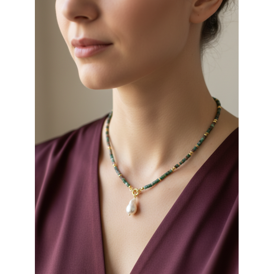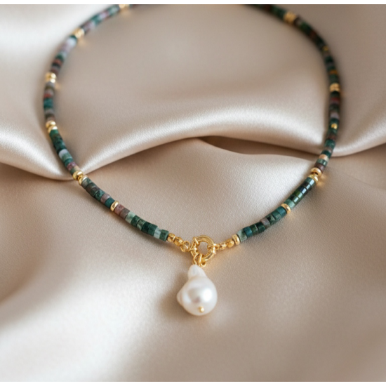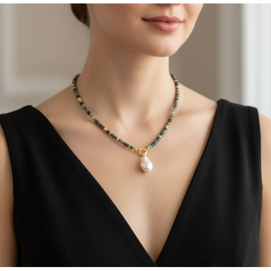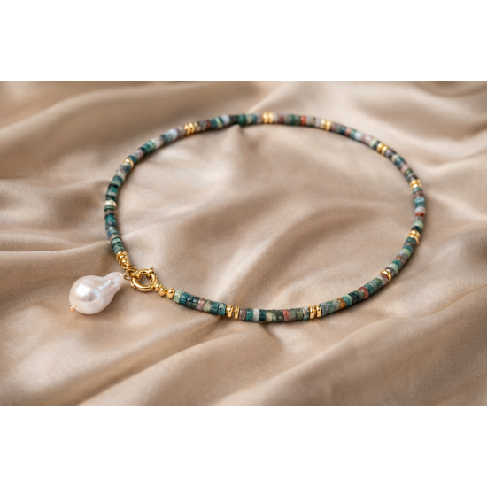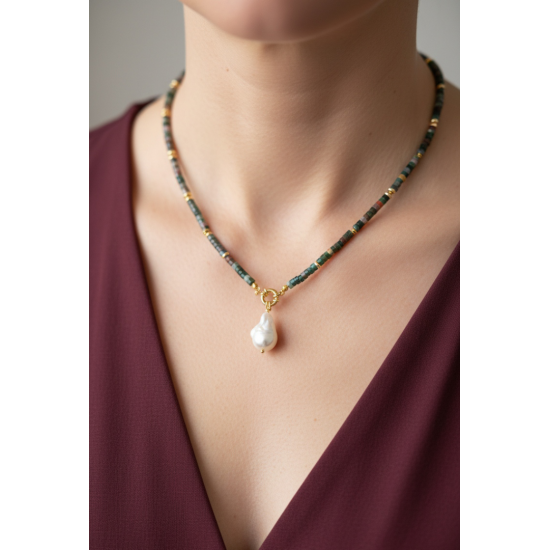 Rondela Kesim Hint Akik Doğal Taş Kolye | Gemici Kilitli Barok İnci Uçlu El Yapımı Tasarım